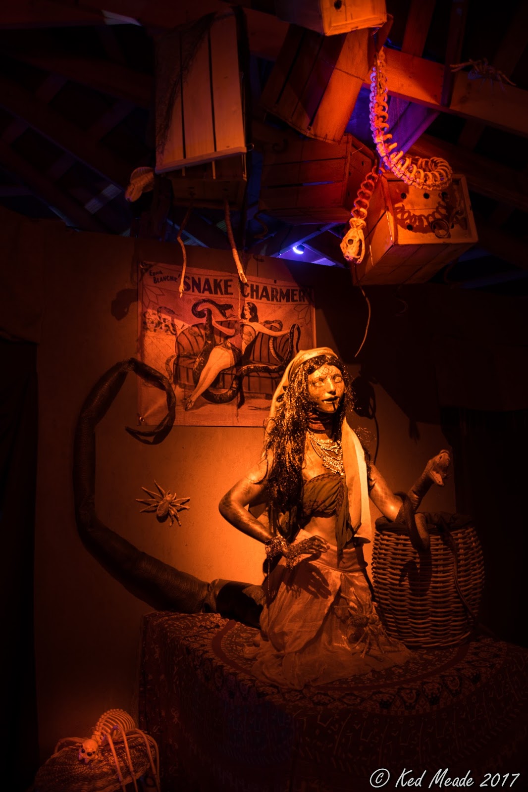 The first room in the tent has a collection of other oddities from around the globe. Dried mermaids, misshapen and horned skulls, skeletons of exotic beasts and even a snake lady!